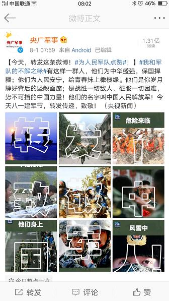 网友建军节为中国军人点赞 单条微博24小时阅读破亿