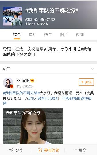 @军报记者 发起的话题#我与军队的不解之缘#,也吸引了众多网友参与。8月1日当天,这个话题的阅读量比前一天增长了30多倍,讨论量增长了300多万条。军人出身的企业家王石、军事专家张召忠、在影视剧中出演过军人的杜淳、于和伟等人,以及贾乃亮、张一山、刘语熙等媒体、娱乐、政务、军事、企业等领域的500多个“大V”,都参与了讨论。
