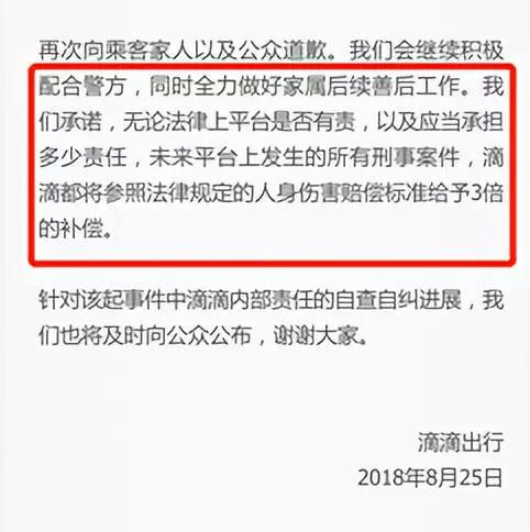 甚至相关说明中还有这么一句:我们承诺,无论法律上平台是否有责,以及应当承担多少责任,未来平台上发生的所有刑事案件,滴滴都将参照法律规定的人身伤害赔偿标准给予3倍的补偿。