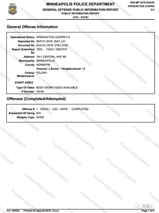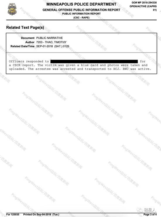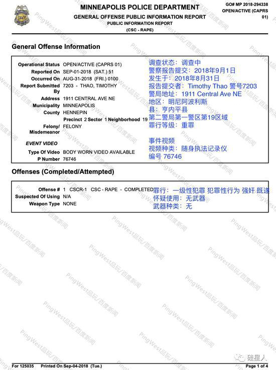 根据明尼阿波利斯警察向PingWest品玩记者/百度新闻特约记者展示的报告,刘强东疑犯一级强奸罪,于8月31日被警方逮捕。
