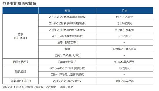 苏宁旗下的PP体育几乎囊括了所有顶级足球赛事,包括西甲、意甲、法甲、英超及中超的版权。在体奥动力与乐视解约中超版权后,苏宁与体奥动力达成合作,双方将联合运营中超版权至2025年,并共同分享收益,苏宁承担大约110亿元的版权费用,而体奥则负责信号制作。
