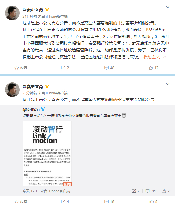新浪科技讯 9月11日下午消息,“国内移动互联网海外IPO第一股”的网秦(现更名为凌动智行)引发了内讧,且愈演愈烈。始人林宇在朋友圈自我宣布回归,称现董事长史文勇涉嫌重大刑事案件,绑架其长达13个月,并受到非人折磨,幸被警方解救。