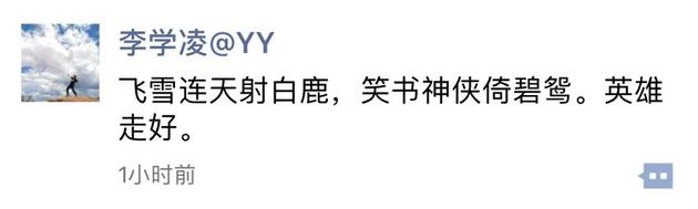 欢聚时代联合创始人、董事长兼CEO李学凌在朋友圈发布了金庸概括自己小说的经典对联,并写道:“英雄走好”。(文子龙)