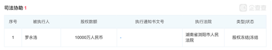 工商信息显示,湖南省浏阳市人民法院已经冻结了罗永浩在成都锤子科技集团的股权,涉及金额1亿元,冻结日期自2019年1月3日至2021年1月2日。