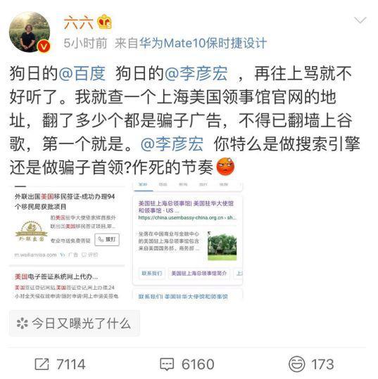 2018年9月6号,作家六六用百度搜索上海美国领事馆,结果出来众多骗子广告,就是找不到上海美国领事馆的官网。绝望之中的六六翻墙用谷歌一试,第一条就是美领馆的账号;