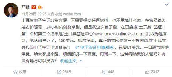 2018年11月,复旦大学教授严锋想要去土耳其旅行,他在百度搜索“土耳其签证”,排名最靠前的网站是“土耳其签证中心”,严锋以为这是土耳其大使馆的签证中心,就花了129美元办理了签证。后来他才发现,这家“土耳其签证中心”根本不是土耳其大使馆的机构,只是一家代办网站。土耳其签证官网收费仅61美元,且电子签证办理十分简单,根本用不着第三方代办。而这家“土耳其签证中心”之所以能够排在百度搜索项的首位,是因为它们给百度交了广告费;