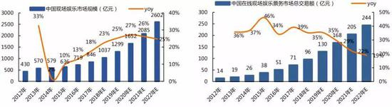 2017年中国电影市场规模761亿元,现场演出(演唱会、现场演出、展会及体育赛事等)市场规模846亿元,而且现场娱乐网上售票的渗透率还很低,只有8.4%。