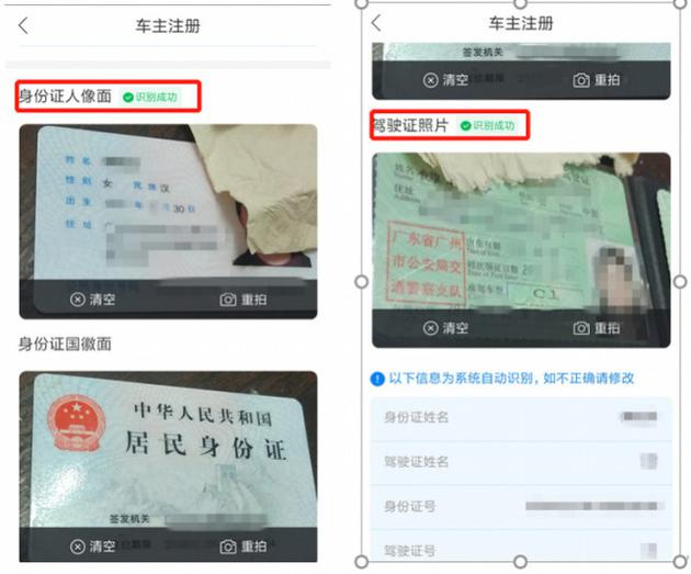 但在平台系统自动识别注册者身份方面或存在漏洞。南都记者以车主身份实测发现,在身份证人像面和驾驶证的照片拍摄识别时,若单独遮挡身份证号或姓名中的任意一项,识别失败;但照片、驾驶证号若显示不完全,比如遮挡身份证头像,系统依然判定识别成功(如下图所示)。不过,下方的信息识别区域支持上述个人信息的手动修改,当身份证号与驾驶证号不一致时,则无法进入下一步。