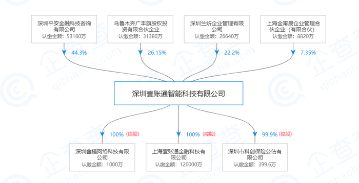 从股东结构来看,根据企查查显示,深圳壹账通智能科技有限公司拥有四个股东,分别是深圳平安金融科技咨询有限公司(股权占比44.3%)、乌鲁木齐广丰旗股权投资有限合伙企业(股权占比26.15%)、深圳兰炘企业管理有限公司(股权占比22.20%)、上海金甯晟企业管理合伙企业(股权占比7.35%)。