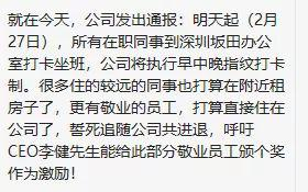 有人人车深圳员工便表示,在接到所有在职同事到深圳坂田办公室打卡坐班,公司将执行早中晚指纹打卡制的通知后,很多住的较远的同事也打算在附近租房子了,更有敬业的员工,打算直接住在公司了,“誓死追随公司共进退!”