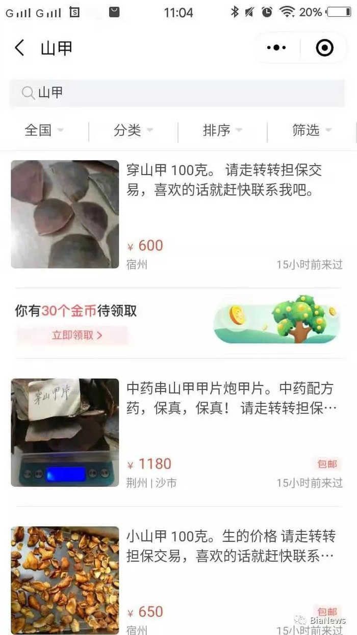 比如搜索“穿山甲”,页面会出现一两条关于中药穿山甲的售卖信息。