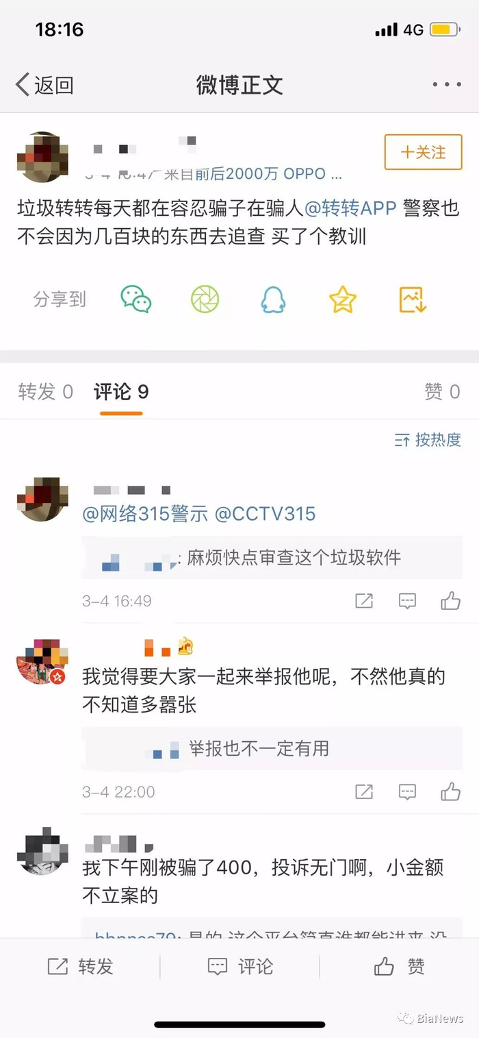 此外,转转平台上的行骗者钻了空子,网友因被骗金额太小而无法选择司法途径追责。还有网友直呼“投诉无门”。