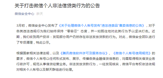 3月18日,微信安全中心公众号发布《关于打击微信个人非法信贷类行为的公告》,对非法发放贷款的用户做出专项清理。