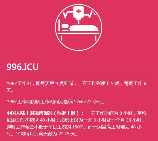 996.ICU 是一句口号的缩写:工作996,生病ICU(重症监护病房)。这个短语源自中国语境,又带点黑色幽默,简单到能让Github上的国外同行轻易理解,它现在以中、英、西、德等八种语言向来访者展示,截至目前,996.ICU已获得18万的加星。