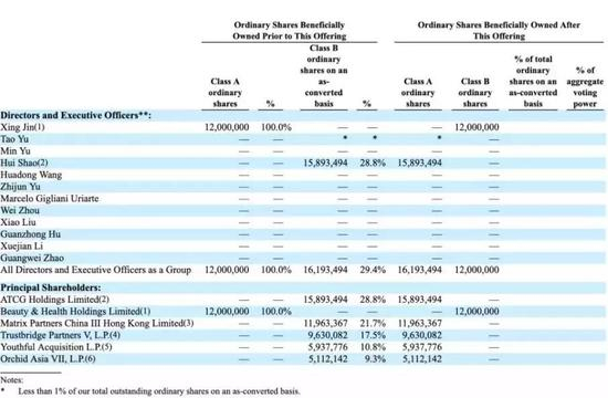 招股书显示,新氧董事邵晖持有公司28.8%的股份,不过,招股书同时也宣布,邵晖辞去公司董事职位,据悉,邵晖是公司的天使投资人,后来又追投了C轮,所以股份比较多,但并未参与过公司管理。据招股书,新氧董事长、CEO金星拥有1200万股A类普通股,此次发行后,金星的A类普通股将转换为B类普通股,拥有超过50%的投票权。
