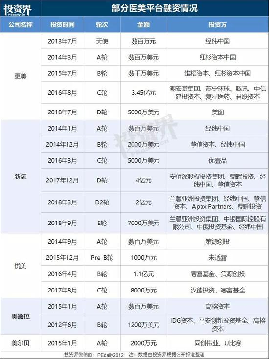 快速增长的医美市场吸引了无数创业者前赴后继,也催生了他们对资本的渴求。可以看到,红杉中国、经纬中国、IDG资本、高榕资本、同创伟业、君联资本等行业知名机构早在3-5年前就开始布局。
