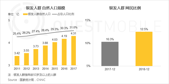 1) 银发人群人口基数逐年上涨,2017年已达总人口的31%,且截至2018年底,我国整体网民中银发人群占比同比上升超过2个百分点,人群发展潜力大