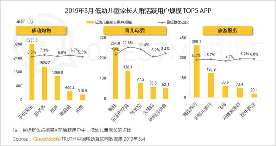 3) 应用偏好方面,在移动购物、育儿母婴、旅游服务领域,手机淘宝、美柚、携程旅行集中了最多的低幼儿童家长人群
