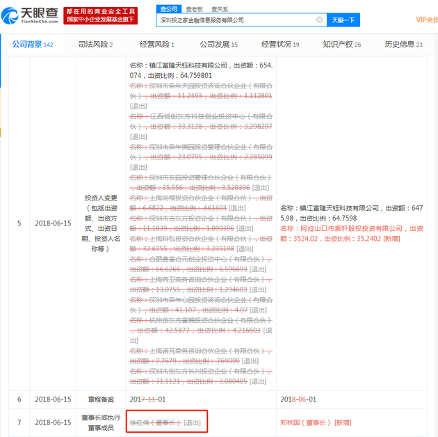 天眼查数据显示,投之家主体公司为深圳投之家金融信息服务有限公司,在2018年7月被警方立案前一个月,该公司13位股东退出,新增股东灏轩投资,注册资本由1千万余元变更为1亿元人民币,同时董事长由网贷之家创始人徐红伟变更为郑林国。目前该公司最大股东为镇江富隆,徐红伟同样于立案前一个月退出。