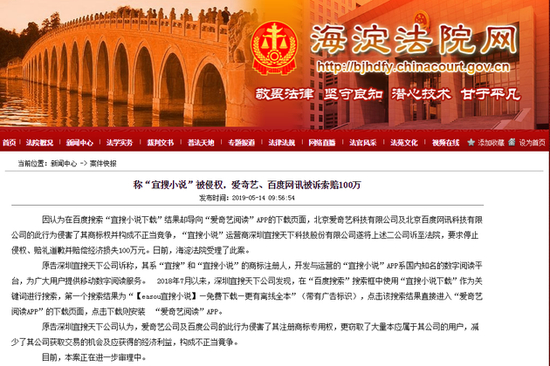 "宜搜小说"称被侵权 爱奇艺、百度网讯被诉索赔100万