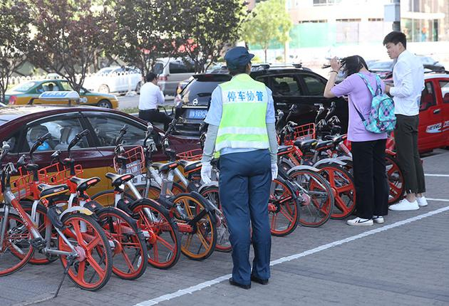 宣武门地铁站附近,停车协管员正在引导市民规范停车。
