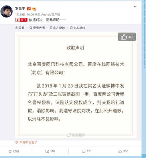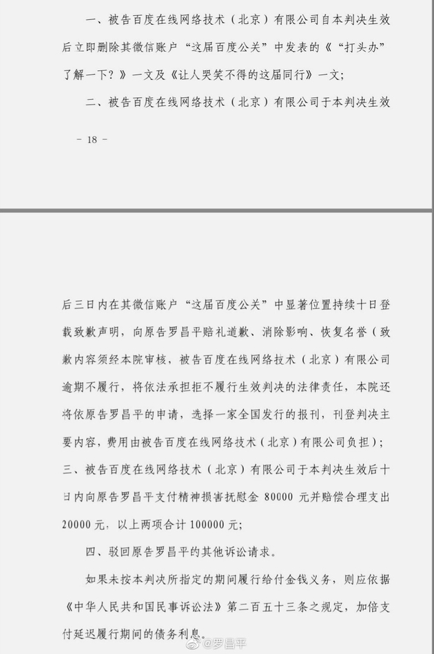 根据罗昌平微博晒出判决书:百度需要立即删除《“打头办”了解一下?》一文及《让人哭笑不得的这届同行》一文,并连续十日在“这届百度公关”中显著位置登载致歉声明,向原告罗昌平赔礼道歉、消除影响、恢复名誉。