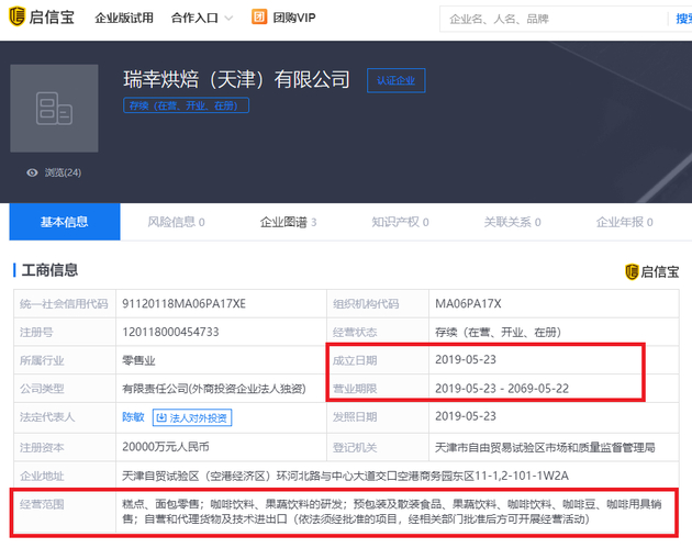 新浪科技讯 5月27日上午消息,启信宝显示,5月23日,瑞幸咖啡(天津)有限公司投资成立瑞幸烘焙(天津)有限公司,法定代表人、执行董事兼经理都由陈敏担任,注册资本2亿人民币。