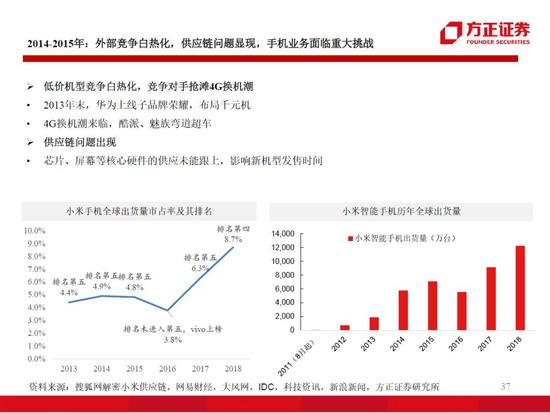 小米两大业务1。 手机方面:面临着巨大挑战,但小米2017年克服危机实现涅槃的过程,证明了其应对挑战的强大韧性。小米“狂奔式发展”的同时也暴露出很多问题,2014-2017年手机经历滑铁卢,但恰恰是小米克服危机的过程,让我们看到其巨大的韧性——内部工程师全力投入研发,黎万强回归主抓渠道,紫米CEO张峰加盟牵头供应链。2。 AIoT方面:“手机+AIoT”是小米铁人三项中的基石,也是小米的长期战略。小米是极少数能够落地十年长期战略能力的公司。第一个原因:资本独立,风控严格。这是米系公司的产品理念决定的,死磕极致大单品、低成本口碑营销、预售模式。所以小米高速成长的过程中,始终现金流健康,还有资金投资布局生态链企业。而套用互联网打法的硬件企业却有大量被资金压垮,王川/多看团队带领的小米电视是一个很好的案例,包括乐视、金立等。第二个原因:小米围绕IoT所需的所有核心要素进行了布局,AI部门战略高度提升,包括云计算方面,投资了金山软件、存储方面投资了世纪互联。