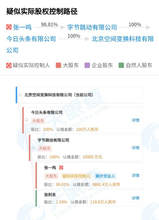 根据值点App产品信息,其开发运营方为北京空间变换科技有限公司。天眼查数据显示,今日头条有限公司是北京空间变换科技有限公司的唯一股东,占股比例为100%控股。今日头条母公司即为字节跳动有限公司。