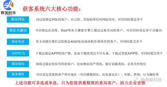 据其介绍,该公司的获客系统十分精准。“你可以指定任意网站或者App,只需要提供网站链接或者App的名称及下载链接,我们就可以抓取到访客的手机号码。”吴辉说。