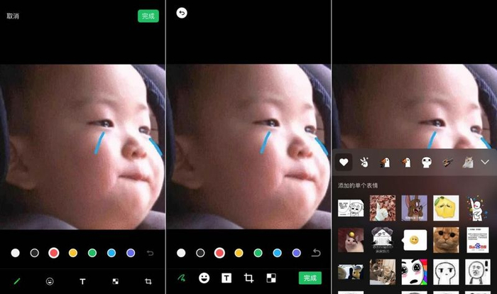 而在选择图片后,依次点击“预览”-“编辑”,也能看到一些小变化:底部图标改变,表情包选择页面变化等。