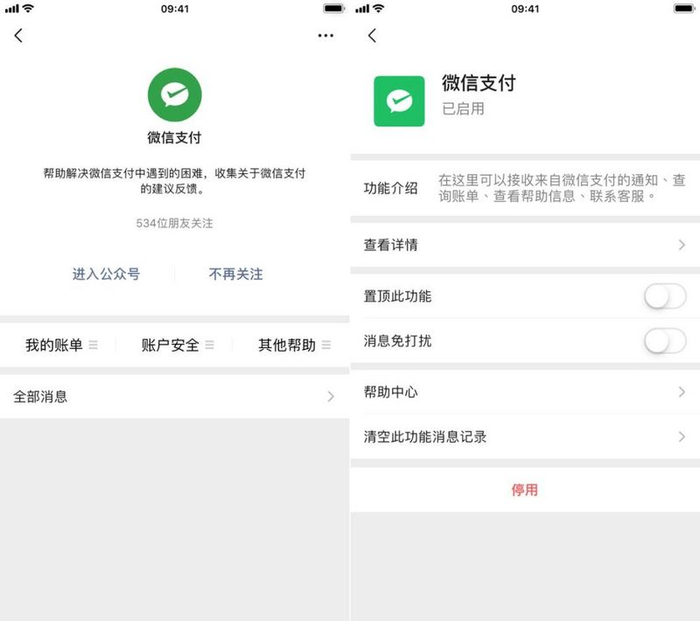 不过,停用后并不会影响微信支付的日常使用,只是查询账单、联系客服、接收通知等功能就不能再微信支付消息通知中查看了。