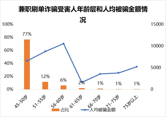 同时,中老年群体由于生活休闲,希望通过兼职增加收入来源,往往容易落入虚假刷单、手工串珠等诈骗手法的陷阱中。白皮书指出,70后遭遇兼职诈骗占比高达77%,而56-60岁的60后群体人均受骗金额超万元。