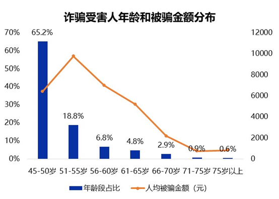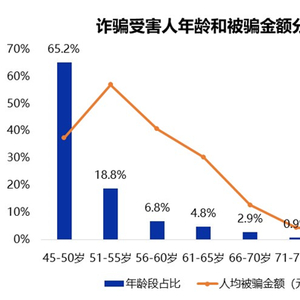 新浪科技讯 10月9日上午消息,腾讯110平台发布《中老年人反欺诈白皮书》(以下简称“白皮书”)。从诈骗受害人群来看,45-50岁的70后群体受骗占比超过65%;60后群体往往有闲置资金,更容易落入虚假投资等骗局,人均被骗金额最大。