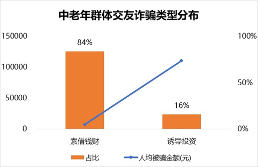 诈骗团伙利用中老年人热爱交友的特点,在日常聊天中建立友好关系,再以突发情况为由借钱、推荐虚假理财产品等方式实施诈骗,是交友诈骗的惯用套路。白皮书数据显示,索借钱财类诈骗占比高达84%;而获取信任后诱导投资,中老年群体人均受骗金额在万元以上,最高被骗金额超过10万元。