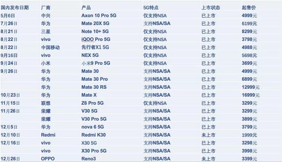 2019年11月1日,三大运营商正式上线5G商用套餐。此后,5G手机的发布更加密集,并且起步价快速下探。11月、12月已有八款3000元档的5G手机发布,小米还发布了起步价仅1999元的Redmi K30。而在11月之前,国内仅有两款3000元档手机发布。与此同时,除了华为之外,vivo、小米、OPPO也相继推出双模5G手机。