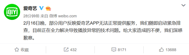 新浪科技讯 2月16日晚间消息,据网友反映,爱奇艺出现无法看视频的情况。对此,爱奇艺通过微博回应称,“目前正在全力解决导致播放异常的技术问题。给大家造成的不便,我们深感歉意。 ”