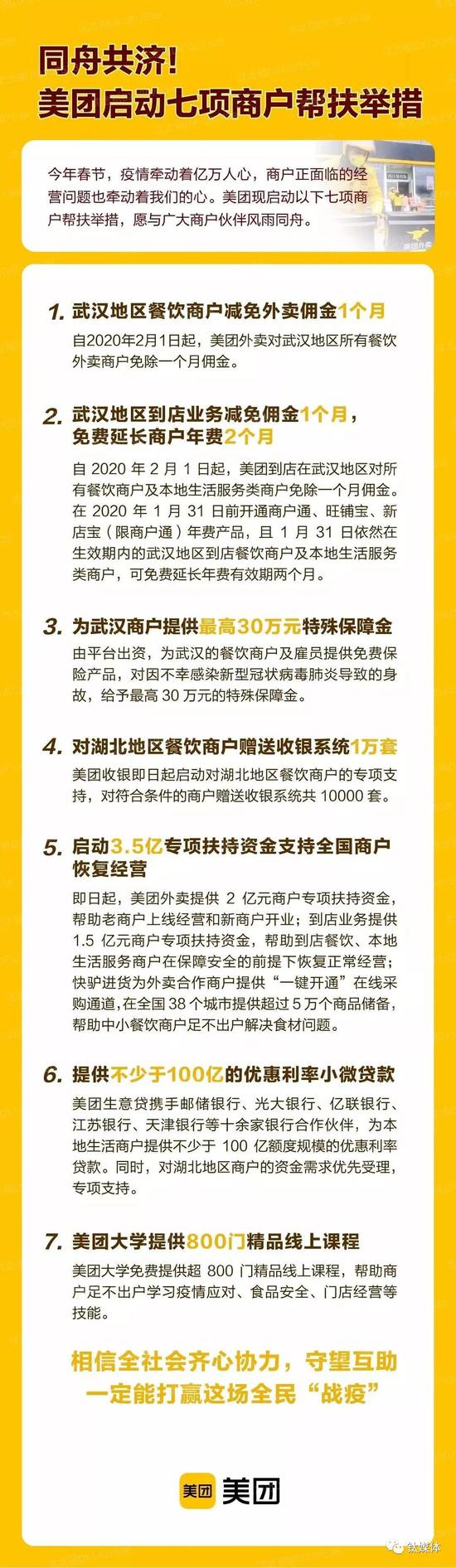 2月17日,美团宣布,在此前的“七项商户帮扶措施”基础上,针对到店餐饮商户及本地生活服务商户的佣金减免措施由武汉地区升级到全国范围。然而,这依旧与对于无堂食、无到店的纯外卖商家没有关系。