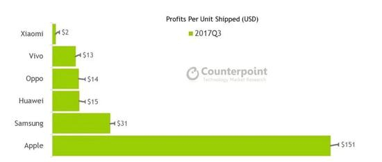 此前,调研公司Counterpoint Research发布的2017年第三季度(也是小米手机增长最快的季度)主流手机厂商每销售一部智能手机赚取的利润显示,小米每部手机赚取的利润仅为2美元,排名在vivo、OPPO、华为、三星和苹果之后。其中,排名第一的苹果每部手机赚取151美元。