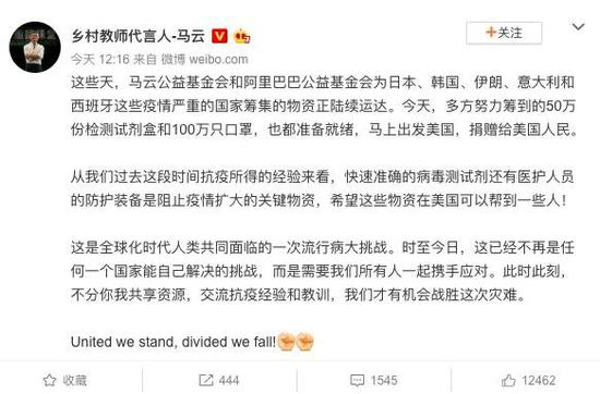 >马云捐赠美国50万份检测试剂盒和100万只口罩。马云公益基金会和阿里巴巴公益基金会为日本、韩国、伊朗、意大利和西班牙等疫情严重的国家筹集的物资也正陆续运达。