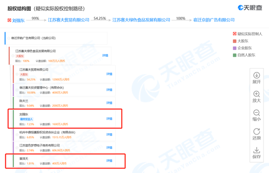 天眼查数据显示,江苏赛夫绿色食品发展有限公司成立于2016年4月6日,刘强东为该公司董事长,持股7.23%;章泽天为该公司董事,持股1.81%。