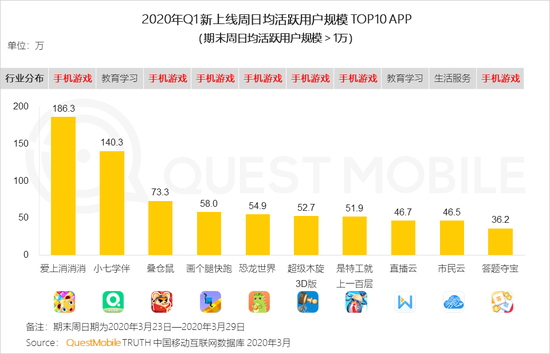 报告显示,按照2020年Q1周复合增长率TOP1000黑马App行业分布数据来看,教育行业254个、手机游戏230个、生活服务90个、办公服务47个、移动社交45个。