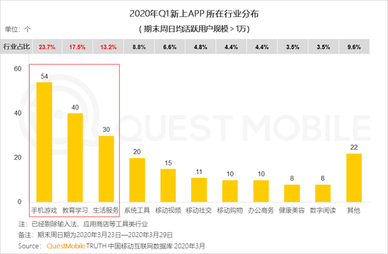3.1 2020年Q1新上App中,半数行业玩家涌入教育学习、手机游戏和生活服务等热门赛道,这些领域中强大的发展潜力和变现能力成为业内创业者的共识