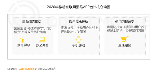 2.1 移动互联网积极助力疫情防控,受高频刚需拉动,教育学习、手机游戏、生活服务和办公商务等行业增长迅猛