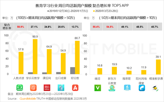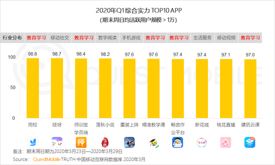4、由于在线学习、线上直播带来用户规模和粘性的双增长,在综合实力TOP10中,定位K12和学习工具的教育行业App占据半数席位