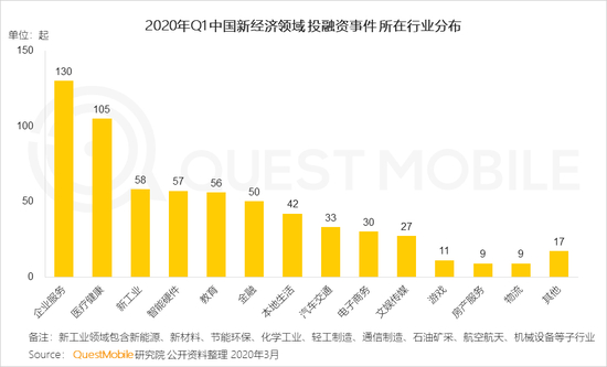 新浪科技讯 4月15日上午消息,QuestMobile数据显示,2020年Q1,医疗健康、企业服务、智能硬件、教育、金融等领域成为热门投资领域。其中,企业服务、医疗健康分别发生了130起、105起投资。