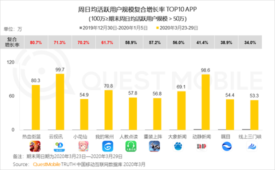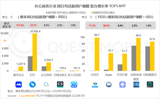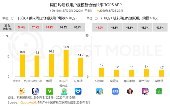 数据显示,具体来看,周日均用户规模大于100万的App中,周日均活跃用户规模增长率TOP 榜,腾讯会议复合增长率117.4%(期末周均DAU 1227.9万),剑与远征复合增长率84.3%(期末周均DAU 188.1万)、无限宝复合增长率82.2%(期末周均DAU 183.3万)、行走大师复合增长率43.4%(期末周均DAU 251.0万)、腾讯课堂复合增长率38.6%(期末周均DAU 755.1万)。