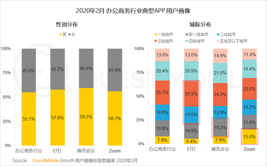 3.4 办公商务App以男性居多,钉钉二三线用户占比高于行业整体,腾讯会议在新一线用户占比高于行业,而Zoom则在一线城市的占比较为突出
