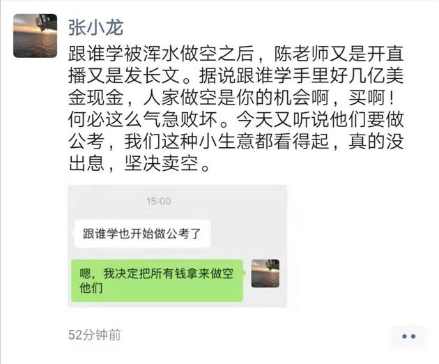 新浪科技讯 4月16日上午消息,粉笔网CEO张小龙在朋友圈发文称,“听说跟谁学要做公考,我们这种小生意都看得起,真的没出息,坚决卖空。”