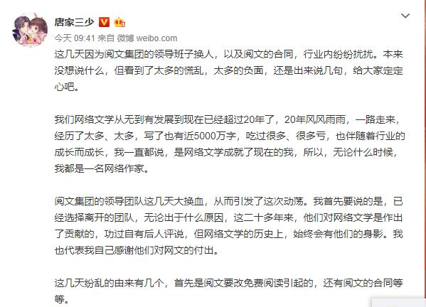 新浪科技讯 5月3日下午消息,近日,阅文集团管理团队换人、新旧合同及是否全面免费阅读引发热议。今日,知名网络作家唐家三少在微博发长文阐述看法。